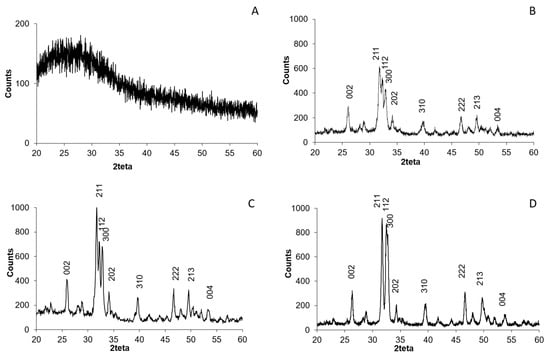 XRD pattern of CSCaP3 (A); CSCaP1C (B); CSCaP2C (C) and CSCaP3C (D) samples.