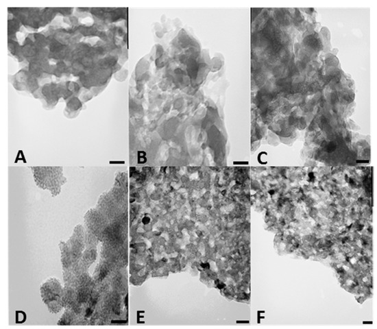 TEM micrographs of CSCaP1OP (A); CSCaP2OP (B); CSCaP3OP (C); CSCaP1C (D); CSCaP2C (E) and CSCaP3C (F). Bars are 50 nm.