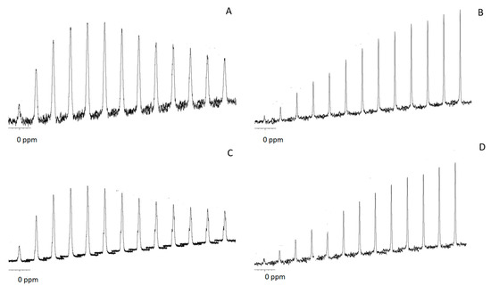 Array of CP spectra at different contact times for CSCaP1 (A); CSCaP1C (B); CSCaP3 (C) and CSCaP3C (D). From left to right contact times: 0.1, 0.5, 1, 1.5, 2, 3, 4, 5, 6, 7, 8, 9 and 10 ms.