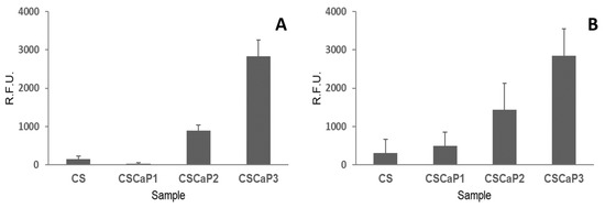 Metabolic activity (Alamar Blue) of cell cultures over CSCaP composites and control (CS monolith). (A) Premyoblastic C2C12GFP cell culture at 7 days and (B) osteoblastic MC3T3 cell culture at 7 days. R.F.U: Relative Fluorescent Units. N = 3.