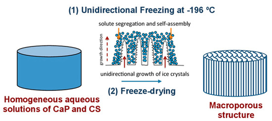 Macroporous three-dimensional structures produced via unidirectional ice segregation of a solution of chitosan containing dissolved Hap, and subsequent freeze-drying. Adapted from References [14,15].