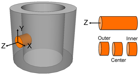 Electrical resistivity along the X, Y, or Z tube directions (noted hereafter ρXexp, ρYexp, ρZexp) was measured using a PPMS 14T system (Quantum Design, San Diego, CA, USA). Bars were cut from the central part of the tube (from z ~ 1.5 to 5.5 mm; see Figure 1), with their longest dimension parallel to X, Y, or Z; sample dimensions were 1 × 1 × 7 mm3 (measurement in X and Y directions) or 1 × 1 × 4 mm3 (measurement in Z direction). Indium contacts were attached to the 1 × 1 mm2 faces, and resistivity was measured by the standard four-probe technique with a 5 mA current. The sample-to-sample reproducibility in room-temperature resistivity was better than 5%.