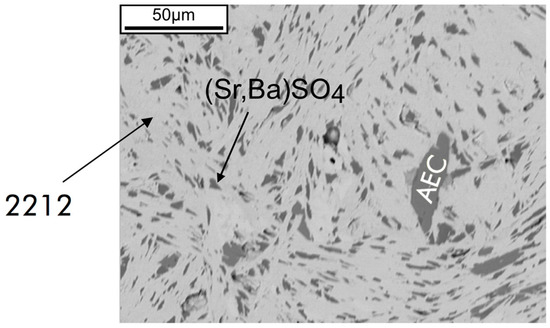 SEM (backscattered electron, BSE) image of a polished cross-section in the central part of the tube showing major second phases (Ba0.13Sr0.87)SO4 and (Sr0.6Ca0.4)CuO2 (1:1AEC) in the Bi-2212 matrix.