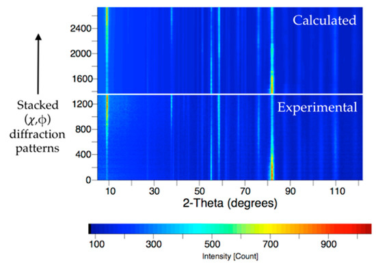 Measured (bottom) and calculated (top) diffraction patterns showing the good refinement quality using combined analysis [16]. All (χ,φ) diffraction patterns are stacked along the vertical axis, with intensity given as a color code according to the bottom bar.