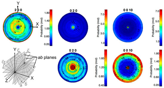 The observed strong difference in 200 and 020 pole figures (Figure 2) may reflect the anisotropy of in-plane growth of Bi-2212, for which the growth rate in the modulation-free direction is known to be an order of magnitude faster than in the direction of modulation (e.g., [24,25]). The structural model of Bi-2212 that takes into account modulation in one of in-plane directions should be used to check this hypothesis.