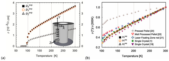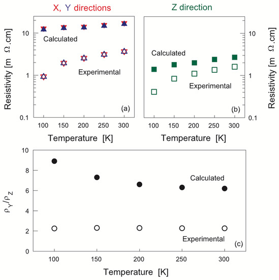 The resistivity values calculated by weighing over crystallite orientations from the refined orientation distribution (OD) determined from neutron pole figures and the measured resistivities are compared in Figure 6a,b. The calculated OD-weighted resistivities are ρXcalc ≈ ρYcalc ≈ 10 mΩ·cm (Figure 6a) and ρZcalc ≈ 3 mΩ·cm (Figure 6b). As expected, the calculation reproduces the lower resistivities in the Z direction compared to X and Y. However, the OD-weighted calculated values are 1.5 times (Z direction) to 10 times (X and Y directions) larger than the experimental ones, depending on temperature.