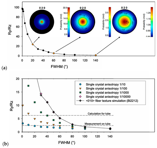 In melt-cast-processed samples, the orientation densities do not typically exceed a few m.r.d., or are even close to randomly-oriented samples. However, the large intrinsic anisotropy of Bi-2212 (104 or more) compensates for the low texture strength. As a further illustration of this combination between texture strength and resistive tensor anisotropy, simulations were performed for a <010>-fiber texture component (i.e., with b // Z) with decreasing maximum orientation densities; i.e., increasing full widths at half maximum (FWHMs) of the Gaussian distribution of the fiber component in the orientation space. The anisotropic resistivity ratio ρYcalc/ρZcalc was then calculated for each texture simulation and for several anisotropies of the single crystal. Figure 7a plots the results of simulations for the Bi-2212 phase, characterized by a very high anisotropy (i.e., resistivity tensor components ρ33/ρ11(=ρ22) = 104). It is worth noting that the ρYcalc/ρZcalc ratio for a “perfect” <010>-fiber texture is only about 102: this highlights the difference between the melt-cast-processed tube studied here and samples prepared by technologies favoring <001>-fiber texture (tapes or uniaxially-pressed bulks, for example). In the present case of <010>-fiber texture, the orientation of ab-planes (see Figure 4) is such that current flow is possible in all directions. Regarding the influence of texture strength, Figure 7a shows that the ρYcalc/ρZcalc ratio decreases from ~100 to ~45 for a 10° FWHM of dispersion and to ~10 for a 40° FWHM. Larger dispersions up to 140° reduce the resistivity ratio to ~2, but for these smaller texture strengths, the dependence of the anisotropy on the FWHM becomes less marked: at low orientation levels, further randomization of conducting planes does not significantly modify the carrier paths. ρYcalc/ρZcalc ratios of 10 or less may seem modest, but additional simulations carried out for less anisotropic phases (ρ33/ρ11 of 103, 102 or 10) show (Figure 7b) that a factor of ~7 such as that calculated for the melt-cast-processed tube would require a much stronger texture if ρ33/ρ11 = 103 or 102, or cannot be achieved if ρ33/ρ11 = 10. Consequently, thanks to the very high resistive anisotropy of Bi-2212 single crystals, melt-cast-processed bulks are still exhibiting comparatively strong anisotropies of their resistivity.