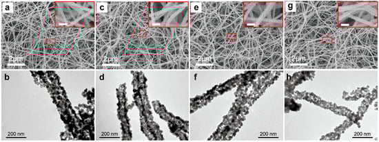 Scanning electron microscope images (a,c,e,g) and transmission electron microscope images (b,d,f,h) images of (a,b) pristine SnO2 porous nanofibers as well as (c,d) 1.0 wt %, (e,f) 4.0 wt %, (g,h) 8.0 wt % Li+-doped SnO2 porous nanofibers prepared by electrospinning and post-calcination at 600 °C in air for 5 h. The insets are high-resolution SEM images (Scale bar: 200 nm). The pristine SnO2 porous nanofibers and Li+-doped SnO2 porous nanofibers showed a porous structure. The Li+-doped SnO2 porous nanofibers can be controlled by changing the ratio of lithium chloride hydrate in precursors.