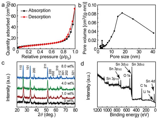 (a) Nitrogen adsorption/desorption isotherms; (b) DFT pore-size distribution plot of 1.0 wt % Li+-doped SnO2 porous nanofibers; (c) XRD patterns of pristine and Li+-doped SnO2 porous nanofibers; (d) XPS full spectrum of 1.0 wt % Li+-doped SnO2 porous nanofibers, which confirmed the presence of Li 1s (~55.0 eV) in the doping sample.