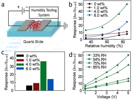 (a) Schematic illustration of the SnO2 porous nanofiber-based sensor; (b) the response vs. the relative humidity (RH) of different doping levels of Li+-doped SnO2 porous nanofibers at 5 V under room temperature; (c) the response comparison of different Li+-doped SnO2 porous nanofibers under 75% relative humidity; (d) the response sensitivity–driving voltage properties for 4.0 wt % Li+-doped SnO2 porous nanofiber sensors under various relative humidity levels.
