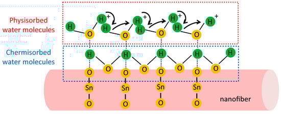 The SnO2-based humidity sensor was then constructed by depositing a pair of Al electrodes, as illustrated in Figure 3a. The response of SnO2 PNF-based sensors at different humidity levels is defined as the ratio of the measured currents at selected RH value and that under dry air. In other words, it can be estimated as S = IRH/Idry air [], where the IRH is the current of the sensor at the selected humidity level, and Idry air is the current of the sensor at dry air condition. Figure 3b shows the response properties of different doping levels of Li+-doped SnO2 PNFs under different RH values. For the pristine SnO2 PNFs, the responses are 1.1, 1.2, 7.2, and 10.0 at the 33%, 54%, 75%, and 85% RH, respectively. The relatively low response, especially under low RH, e.g., 33% and 54%, is limited mainly by a poor adsorption ability of water molecules. Obviously, the water concentration in air has a strong influence on the humidity response of SnO2. The basic humidity sensing mechanism on the SnO2 is explained by the sorption of water molecules onto the surface, which is usually described by the condensation of water molecules onto the sensor surface, inducing the proton conduction and consequently causing a change in the net conductivity of the sensor []. At a relatively low RH value, the chemisorption occurs to form two surface hydroxyls per water molecule []. With increasing humidity levels, the physisorption of water molecules takes place, resulting in capillary condensation and conduction by the Grotthuss transport mechanism [], further enhancing the humidity sensing properties. Therefore, humidity sensing was detected as increasing with the increasing RH value. The schematic representation of SnO2 PNFs on the humidity sensing performance is illustrated in Figure 4.