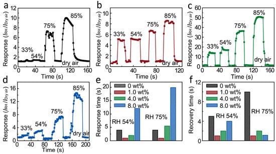 The response and recovery properties at DC 5 V with an Li doping level of (a) 0, (b) 1.0, (c) 4.0, and (d) 8.0 wt %, respectively, at different relative humidity values; The comparison of (e) the response time and (f) the recovery time of different Li+-doped SnO2 PNFs at relative humidity levels of 54% and 75%, respectively.