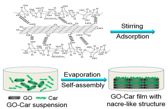 Sijun et al. studied the gel properties of graphene and carrageenan. A schematic diagram has been proposed to explain the effect of ammonia-functionalized graphene oxide (AGO) on the gelation of κ-carrageenan. AGO sheets have been shown to attract a number of κ-carrageenan chains through hydrogen bonding and electrostatic interactions between sulfate groups of κ-carrageenan and amine groups of AGO [23]. Liu et al. conducted experiments examining GO-carrageenan (GO-Car), with the resulting GO-carrageenan (GO-Car) composite being further used as a substrate for biomimetic and cell-mediated mineralization of hydroxyapatite (HA) [22]. However, there is a lack of studies examining the artificial nacre-like graphene oxide-carrageenan bio-nanocomposite films.