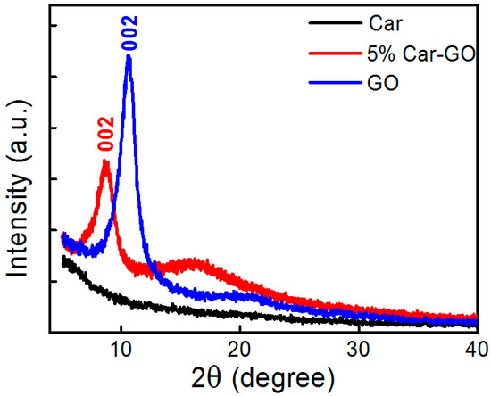 X-ray diffraction (XRD) patterns of GO, Car and 5% GO-Car nanocomposite films.