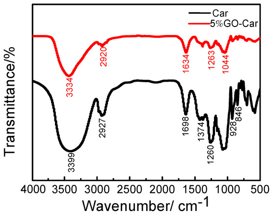 According to the results from the Fourier Transform Infrared Spectroscopy (FT-IR) spectrogram (Figure 4) of carrageenan and 5% wt. GO-Car hybrid, there were strong interactions between GO and Car molecules. In the IR spectrum of carrageenan, the absorption peaks at 2927 and 1374 cm−1 were the stretching vibration and bending vibration of carbohydrate C–H, respectively. The absorption peaks at 1260, 928 and 846 cm−1 were the characteristic absorption peaks of C–O–C and C–O–S stretching vibrations in carrageenan molecules.