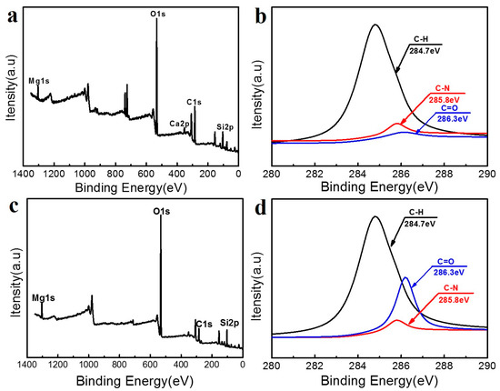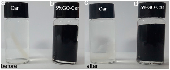 XPS was used in order to further explore the interaction between GO and Car. In the XPS spectrum, the position of each line corresponds to the binding energy of the electrons. The XPS spectra test for Car with a core of C1s is shown in Figure 6b. The C1s peak at 284.7 eV belonged to C–H, while the C1s peak at 285.8 eV belonged to C–N. The peak height of C–H was found to be significantly higher than the peak of C–N, with the C elements in Car being mainly C–H, followed by C–N. The XPS spectra test for GO-Car with a core of C1s is shown in Figure 6d. The C binding energies were 284.7 and 286.3 eV, respectively, which belonged to C–H and C=O. Compared with Figure 6d, the C–N bond is the main component in the C1s of carrageenan (Figure 6b), because the carrageenan is a galactose formed by two galactoses. In comparison, C=O occupies the main position in GO-Car (Figure 6d), which may be the result of graphene oxide having played a certain role in promotion. There was no obvious change in the intensity of each peak, suggesting that there was no new chemical bond formation during physical mixing. It was thought that physical mixing led to the formation of new hydrogen bonds.