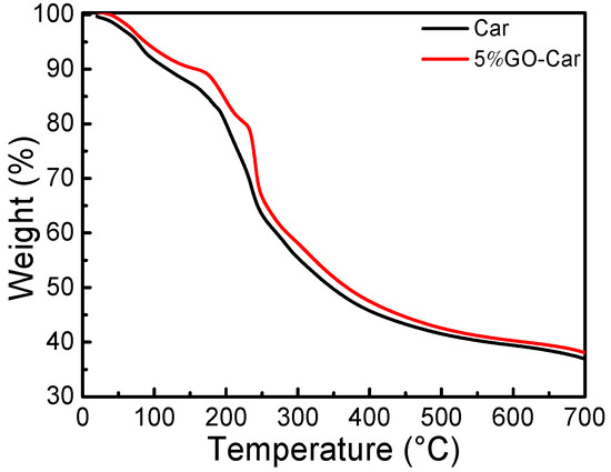 It can be seen from Figure 7 that the thermal decomposition of Car film began at 65 °C, while the thermal decomposition of the GO-Car nanocomposite films began at 72 °C. The thermal stability of GO-Car nanocomposite films was better than the pure Car film. At 100 °C, there was no significant degradation of weight loss, which might be due to the loss of water molecules in the matrix. It can be seen from Figure 7 that the thermal decomposition occurred in the range of 100–350 °C. There was a loss of most of the oxygen-containing functional groups, hastening the weight decline. In GO-Car nanocomposite films, the oxygen-containing functional groups decomposed into CO and CO2 [31]. When the temperature exceeded 200 °C, the polymer chain of carrageenan was destroyed. After 500 °C, the thermal weight loss was very slow, with the thermal decomposition gradually becoming stabilized.