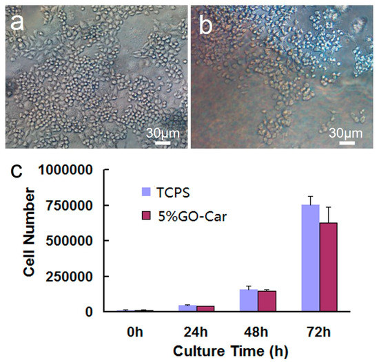 The cytotoxicity of GO-Car nanocomposites was evaluated through growing RAW264.7 cell on the films for 48 h. Figure 10 depicts the influences of GO-Car nanocomposite films on cellular morphology and cell proliferation, using the inverted microscope (Nikon ECLIPSE Ti-S, Kanagawa, Japan) and MTT colorimetric assay. Cells adhered on the surface of nanocomposite films had clear outlines, with the oval shape being similar to the control group tissue culture polystyrene (TCPS). These results indicated that GO-Car nanocomposite films did not affect cellular morphology and cell proliferation. Therefore, the nanocomposite films with outstanding cell biocompatibility might have a promising application in the field of tissue engineering-oriented support materials.