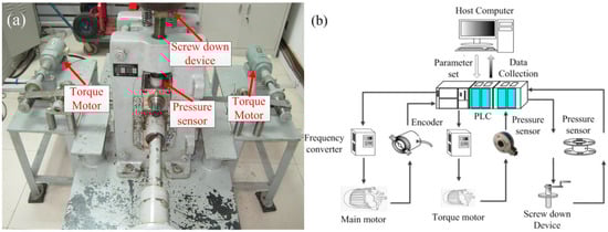 The 3M mill is a new type of rolling mill with an ultra-thin rolling capacity developed by our research group and is shown in Figure 1. The main parameters and characters are as follows: backup roll diameter: 120 mm, work roll diameter: 50 mm, roll barrel length: 130 mm, maximum roll force: 200 kN. The speed ratio between the up and down rolls can be changed from 1 to 1.3 continuously.