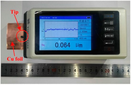 The surface roughness of the Cu samples was measured by a high precise roughmeter, which is shown in Figure 3. The radius of the test tip marked by the red row in Figure 3 was 2 μm, testing force of the stylus was 0.75 mN, and the resolution was 0.001 μm. The measured surface roughness was the root mean square value of the ordinate in 0.800 mm sampling length, and the measured value was expressed as