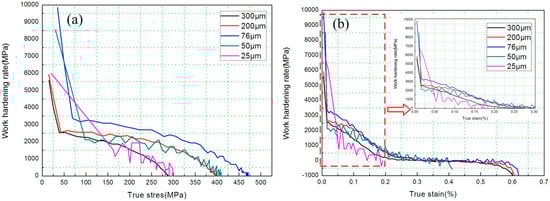where and are the macroscopic true stress and true plastic strain, respectively. is a derivative of a state function . Based on the afore-mentioned true stress–strain curves, was plotted vs. the true stress and strain for the commercial pure copper of thicknesses from 25 μm to 300 μm (Figure 5a,b, respectively). All curves in Figure 5 displayed an initially steep decrease in for strains of less than ~0.2%, which corresponds to the elastic-plastic transition. Subsequently, there was an approximately linear decrease of as the true strain increased, analogous to the conventional stage Ⅲ hardening described by the Kocks–Mecking model [30,31]. The sample with a thickness of 25 μm offered a distinctly reduced hardening rate at both higher stress and higher strain. Comparing the hardening rate values of the other samples, which were thicker than 76 μm, it was clear that the heavier strain enhanced appreciably. However, the phenomenon was different from the above-mentioned when the sample thickness was below 76 μm, which is consistent with the tension results in Figure 4.