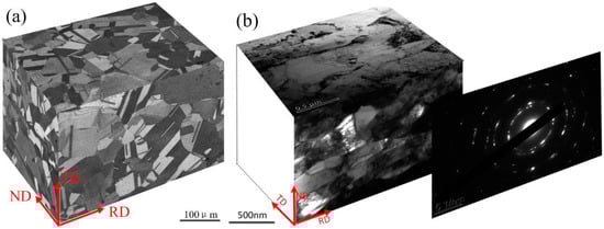 The microstructure of the deformed samples was investigated by transmission electron microscopy (TEM). The TEM study was carried out using a Tecnai G220 transmission electron microscope (FEI Technologies Inc., Hillsboro, OR, USA) operated at 200 kV. The observation sections were perpendicular to the transverse direction (TD) and normal direction (ND) of the rolled foil. To perform a systematic TEM investigation, a special technique for the preparation of thin foils was implemented, which was the focused ion beam (FIB, FEI Technologies Inc., Hillsboro, OR, USA) technique.