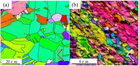 Figure 6a,b shown typical optical microscope (OM) and transmission electron microscope (TEM) morphologies of pure copper, which was as-received with a thickness of 5800 μm and processed by cold rolling with a thickness of 25 μm, respectively. In addition, Figure 7a,b display electron back-scattered diffraction (EBSD) mapping of the above sample.