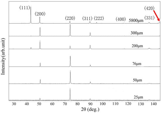 It indicates that material behavior changes from single crystal to polycrystal material when the size factor varied from 2 to 0. As the thickness decreased, the ratio of surface grains increased significantly. In addition, in the TEM observation above, grain sizes were not further refined as thickness decreased from 76 μm to 25 μm. Furthermore, we found that the surface grains were refined to almost equiaxial crystals when internal grains size remained unchanged (Figure 16). This means that the surface grains increased significantly from 76 μm to 25 μm.