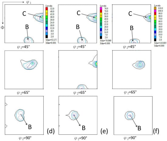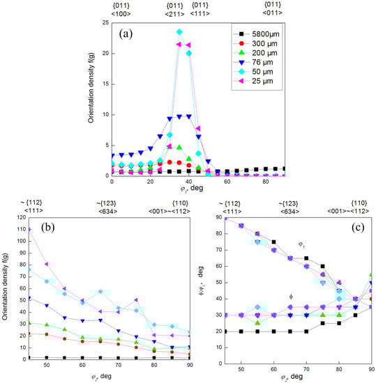 Figure 10 shows the orientation distribution function graphs of surface of Euler angles space for the = 45°, 65°, and 90°, calculated for pure copper with different thicknesses from 5800 μm to 25 μm. In addition, Figure 10 shows the α-fiber, β-fiber, and β-fiber position courses in the Euler angle space, respectively. Material before rolling treatment (see Figure 10a) had a texture dominated by the rotate cube component {100}<011>, which is a basic component of recrystallization textures in pure FCC metal with medium to high stacking fault energy [39]. Ultra high strain cold rolling from 5800 μm to 25 μm led to a significant change and sharpening of texture [40]. For asymmetrical rolling copper (thickness 300 μm, Figure 10b), the maximum value of the ODF was nearly 20 times greater than for the starting material, whereas in the case of further asymmetrical rolling samples (see Figure 10c–f) was about 50 times greater. Pure copper rolled with equal speed of both rolls and asymmetrical ratio 1.2, had a typical rolling texture of pure metal type, which is formed by the copper (C) {112}<111>, brass (Bs) {011}<211>, and the S {123}<634> (observed in Figure 11). Increasing of the strain led to further rolling texture sharpening, with a noticeable rise in intensity of the rolling texture component {011}<211>, instead of typical shear texture {001}<110>, {111}<110>, and {111}<112>, that may be the texture genetic effect of symmetrically rolling from 5800 μm to 76 μm.