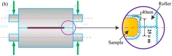 Due to micro rolling, the geometry scale of pure copper spanned from macro to micro, where it was rolled from 5800 μm to 25 μm without intermediate annealing at room temperature. The notable character of micro rolling was the negative roll gap, that is, the elastic contact deformation between the work roll, which remained outside the loaded roll gap. Figure 12 shows the difference between normal gap rolling and negative gap rolling. It was clear that the rolls bent elastically without contacting each other in the normal rolling gap (Figure 12a), in contrast, the roll elastic contacted each other apart from flattening in negative rolling gap (Figure 12b). Furthermore, the transverse compression, which significantly improves the plasticity of pure copper [41], was increased by the negative gap rolling [42], and may be due to more active slip systems. In the different rolling process, the friction was increased as the thickness varied from macro to micro, which is in agreement with the literature [43]. The surface roughness of the samples ranged from 300 μm to 25 μm were listed in Table 2. It can be clearly seen that the surface roughness is increased as the thickness decease, which is in agreement with the literature [44,45].