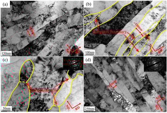 With respect to the size effect of ultimate strength, some variance in microstructure for pure copper samples of different thicknesses was expected, in particular for the grain refinement (e.g., change of grain sizes) and the dislocation density. The TEM investigation shown in Figure 13 provided important information on the mechanism of microstructure evolution due to ASR + micro rolling. Ultra-high strain led to the formation and multiplication of ultrafine microstructures approximately parallel to the RD, which contain thin laths and elongated subgrain structures consisting of dislocation cells (Figure 13a). The grain sizes were refined from ~60 μm to ~120 nm subject to cold rolling to 76 μm. As a result of the improved shear deformation [47], the lath areas became curved, and some lath regions appear to have been locally extruded out to form a bulge (the lath boundaries and subgrain boundaries are marked by the yellow line and dotted line, respectively, in Figure 13b). It was suggested that the formation of a bulge tends to accelerate the lath splitting process in pure metal deformation [48]. Meanwhile, the dislocation accumulated at several locations to form a transverse dislocation wall as a “bamboo node” (some examples are marked by the red arrows in Figure 13c), which led to the breakdown of the laths into elongated segments [49]. The dimensions of those segments were ~80 nm wide and 200 nm long, which parallel to the RD. However, with further deformation, the grain refinement was non-significant, and the (sub)grain size was remind ~120 nm (Figure 13d, thickness 25 μm). With increased deformation, the dislocation walls received dislocations and increased their misorientations until they finally became transformed into high-angle boundaries (Figure 14), and it was shown that the fraction of high-angle boundaries increased when the sample thicknesses were decreased from 5800 μm to 25 μm.