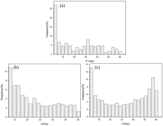 Distribution of angle between the (sub)grains of pure copper with thicknesses of (a) 5800 μm; (b) 76 μm; and (c) 25 μm.