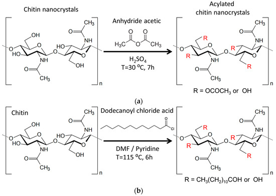 Scheme representing the heterogeneous chemical functionalization of chitin nanocrystals using: anhydride acetic (a); and dodecanoyl chloride acid (b).