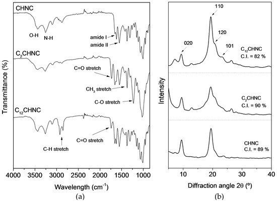 (a) ATR-FTIR spectra; and (b) X-ray diffraction of CHNC and acylated chitin nanocrystals (C2CHNC and C12CHNC).