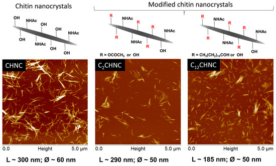 This data corroborate with the sizes of CHNC and functionalized chitin nanocrystals that were roughly estimated using AFM imaging (Figure 3) and were found to be approximately 300, 290 and 185 nm in length (L) for CHNC, C2CHNC and C12CHNC, respectively. Actually, after the heterogeneous surface modification, the ensuing C12CHNC showed an important decrease of their length, justified by the partial detachment of the modified fibrils from the crystalline structure [55]. No significant changes were observed in the width (Ø) of the samples after the reactions. The typical rod-like morphology of the samples remained after the chemical modification.