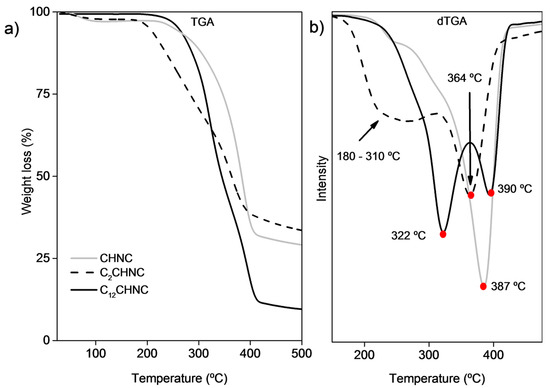 TGA (a); and dTGA (b) profiles of CHNC, C2CHNC and C12CHNC.