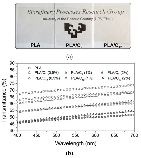 Photographs of PLA, PLA/C20.5 and PLA/C120.5 nanocomposite films (a); and transmittance traces of PLA film and PLA/C2 and PLA/C12 nanocomposite films (b).