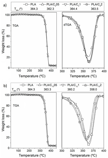 Like for the modified CHNC, the thermal stability and degradation profiles of the PLA nanocomposite materials were assessed by thermogravimetry (Table 1). The TGA profile of the PLA film exhibits a typical single weight-loss step, with a maximum decomposition rate at 364 °C. The thermal decomposition process of all the PLA/C2CHNC (Figure 7a) and PLA/C12CHNC (Figure 7b) nanocomposites also presented a single weight loss step profile. The thermal stability profiles of all samples were very similar without important changes, contrarily with Guan et al. work [15] where the thermal degradation of PLA bionanocomposites with 2% of chitin nanocrystals decreased about 25 °C.