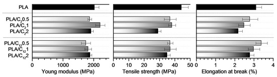 The mechanical properties of PLA films and nanocomposite films were evaluated in terms of Young’s modulus, tensile strength and elongation at break (Figure 8). The unfilled PLA films showed characteristic values in Young’s modulus at around 2 GPa, in tensile strength of 44 MPa and elongation at break of 3.1% [60,61]. Contrary to previous works [20,62,63] related to the incorporation of CHNC into PLA matrices, in the present work, a minor loss in modulus and tensile strength was observed when the modified CHNC were incorporated in the PLA matrices. This effect was associated to the C2CHNC and C12CHNC aggregation. However, PLA-based nanocomposites prepared with other type of nanofillers (i.e., nanocrystalline cellulose, and nanoclays) also showed no significant effect on the mechanical properties of the final materials [14]. Regarding elongation at break, characteristic decrease of this parameter was observed in all materials due to the incorporation of crystal nanofillers.
