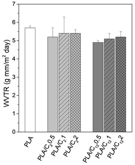 The water vapor transmission rate (WVTR) of PLA-based nanocomposites was analyzed because of the potential use of these materials in food packaging. The assessment of this parameter is important because of the role of water in microbial development and deteriorative effects. In general, the data listed in Figure 9 demonstrate a slight decrease in the WVTR, which is directly associated with the incorporation of hydrophobic groups on the surface of the CHNC. The range of values is in accordance with those found in previous works [43]. As expected, the decrease in the WVTR is more evident for the PLA-based nanocomposites prepared with the CHNC modified with fatty aliphatic chains. The amount (0.5%, 1% and 2%) of both sets of CHNC did not significantly affect the WVTR. These results are consistent with the water contact angles measurements.