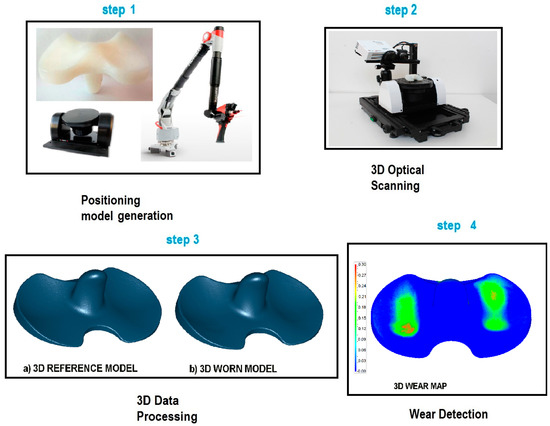 The proposed technique to detect and measure wear implies the use of optical non-contact 3D scanners for metrology and a wide range of applications including inspection and quality control. The digital procedure can be performed by following the steps according to the scheme in Figure 1.