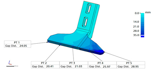 - The wear distribution was evaluated by comparison between the volumes calculated on the CAD and worn model and the reference points were checked to get the value of the gap distance, representing the material loss. The result is shown in Figure 4.