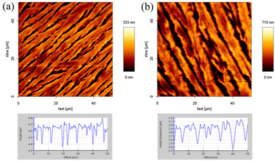 Atomic force microscopy (AFM) images (50 μm × 50 μm) and cross-section height profiles at: (a) 2 mM; and (b) 8.1 mM.