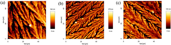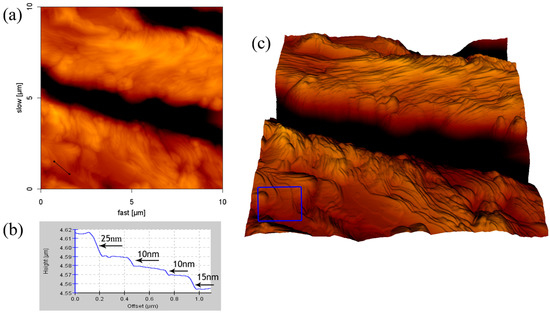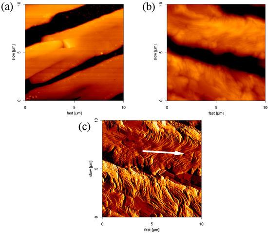 Figure 1a,b are enlarged and shown in Figure 2a,b, respectively. The edge of the parallel structure is smooth. Figure 2c is an AFM error signal image from Figure 2b. It is clear that SDS molecules self-assembled to form an ordered structure on borosilicate glass through layer-by-layer deposition. We also observed that the formation of the layer had an orientation outwards (indicated by the white arrow in Figure 2c). This phenomenon was assigned to the outward capillary flow during evaporation [34]. On the basis of the results, it is concluded that the height of the adsorbed structures are affected by the surfactant concentration, but the morphology and the aggregate structure do not change.