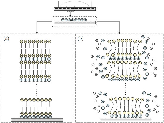 In previous literature, the SDS formed hemicylindrical structure on the graphite surface since the hydrophobic substrates interact with the carbon chains through van der Waals forces [19,31]. According to the AFM results mentioned above, we observed the stacking formation and the morphology of the aggregates, which is similar to the aggregation of SDS on the mica and ZnSe surface [22,23]. These observations provide some information to postulate the mechanism of the adsorbed process as represented in Figure 8. It is well-known that borosilicate glass is a negatively-charged surface with hydrophilic properties, and the DS- has a negatively-charged head group. Figure 8a gives the possible mechanism for the formation of the SDS film. When the SDS solution is dropped on the glass surface, the negatively-charged sites of the borosilicate glass binds the cations through attractive electrostatic interaction [30]. The negative DS- head group adsorbs on the Na+ ion layer, and the hydrophobic carbon chain of the SDS is upward. Then, the hydrophobic carbon chains of the SDS link together by the van der Waals force to form a deposited bilayer. In the drying process, the two parallel and negatively-charged surfaces are forced to approach mutually and create a thin layer between the two surfaces. This thin layer has the potential for counter ions to compensate the charge repulsion. Thus, Na+ ions penetrate into the negative interface between the DS- head groups to compensate for the charge density and result in a bilayer [22]. Finally, a lamellar structure of stacking bilayers forms.