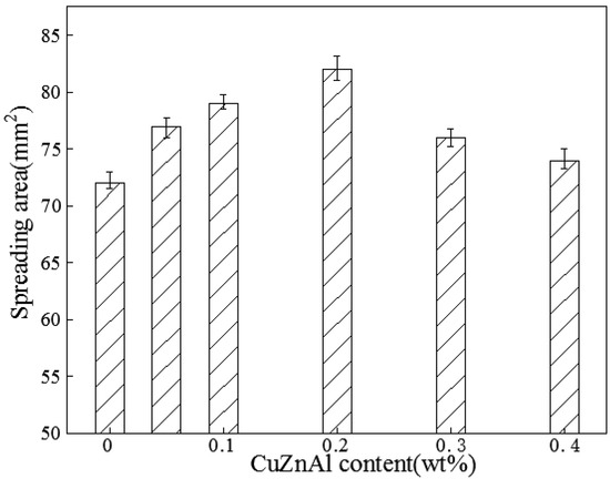 Spreading area of Sn-58Bi-xCuZnAl composite solders.