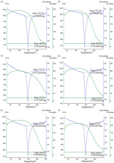 The melting characteristics of Sn-58Bi-xCuZnAl; (a) x = 0; (b) x = 0.05; (c) x = 0.1; (d) x = 0.2; (e) x = 0.3; (f) x = 0.4.