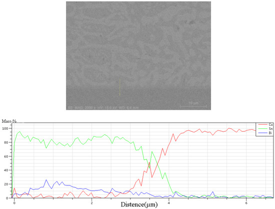 SEM morphology and EDX line scan profiles of interface between Sn-58Bi and Cu substrate.