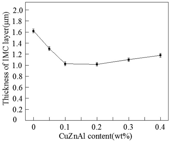 where A is the integral area of IMC layer; is the length of the IMC layer. As could be seen from the Figure 9, when the CuZnAl particles were added into the Sn-58Bi solder, the thickness of the interfacial IMC layers was reduced obviously. In the Figure 7a, the shape of interfacial IMC layers was scallop without CuZnAl particles. The thickness of the IMC layer was 1.62 µm. Nevertheless the thickness of the interfacial IMC layer decreased from 1.62 to 1.28 µm after 0.05 wt % CuZnAl particles were added into the Sn-58Bi solder. Furthermore, the trend of abatement continued with further CuZnAl particles addition. When the addition of CuZnAl particles was 0.2%, the thickness of IMC layer decreased to 1.03 µm. The interface became flatter. However, as the content of CuZnAl particles increased, the thickness of IMC layers between the composite solders and Cu substrate became slightly thicker. Because CuZnAl particles diffused in the Sn-58Bi solder and the interface between the composite solder and Cu substrate. It reduced the grain boundary migration activation energy.