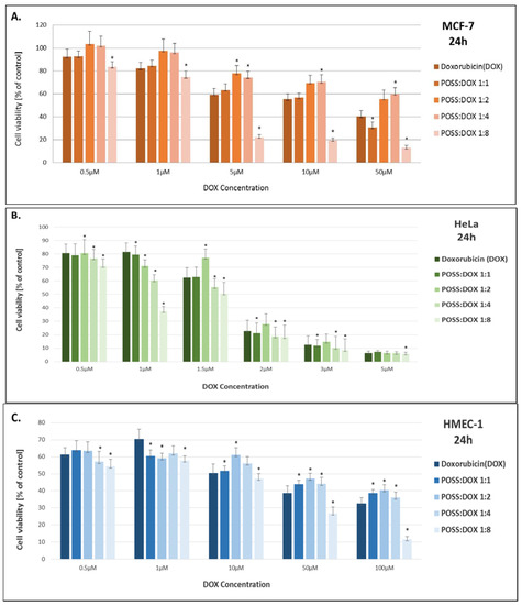 The influence of doxorubicin and polyhedral oligomeric silsesquioxanes co-delivered at different molar ratios on cell viability (A) of human breast adenocarcinoma (MCF-7), (B) microvascular endothelial (HMEC-1), and (C) human cervical cancer endothelial (HeLa) cell lines. Data are presented as a percentage of control ± SD, * p < 0.05 (statistical significance between DOX and POSS:DOX complexes).